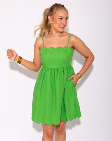 View full detailsGet ready to turn heads in our Green Grace Scallop and Bow Tie Back Mini Dress! This solid-colored mini dress features adjustable shoulder straps f...