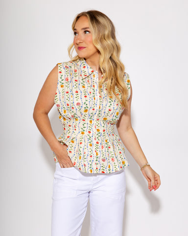 View full detailsFresh, flattering, and full of feminine charm, this sleeveless button-up top features a collared neckline and a pleated, fitted waist that flows in...