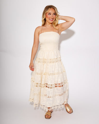 View full detailsEffortless and airy, this strapless midi dress is crafted from breathable cotton crochet lace with a romantic eyelet design throughout. The smocked...