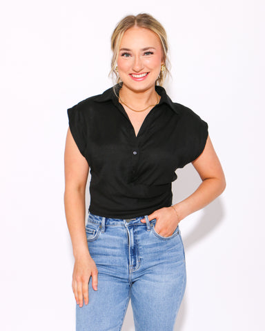 View full detailsExperience effortless style and sophistication with The Collared Wrap Top in Black! This stunning V-Neck Lapel Collar Wrap Crop Top will elevate yo...