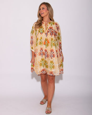 View full detailsBreezy and effortless, this mini dress is your new warm-weather favorite. Set against a natural-colored background, the dress features gauzy three-...