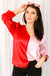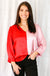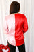 Solid glossy material color block top with a V-neckline and three quarter puff sleeves. - Unlined, non-sheer, lightweight.