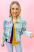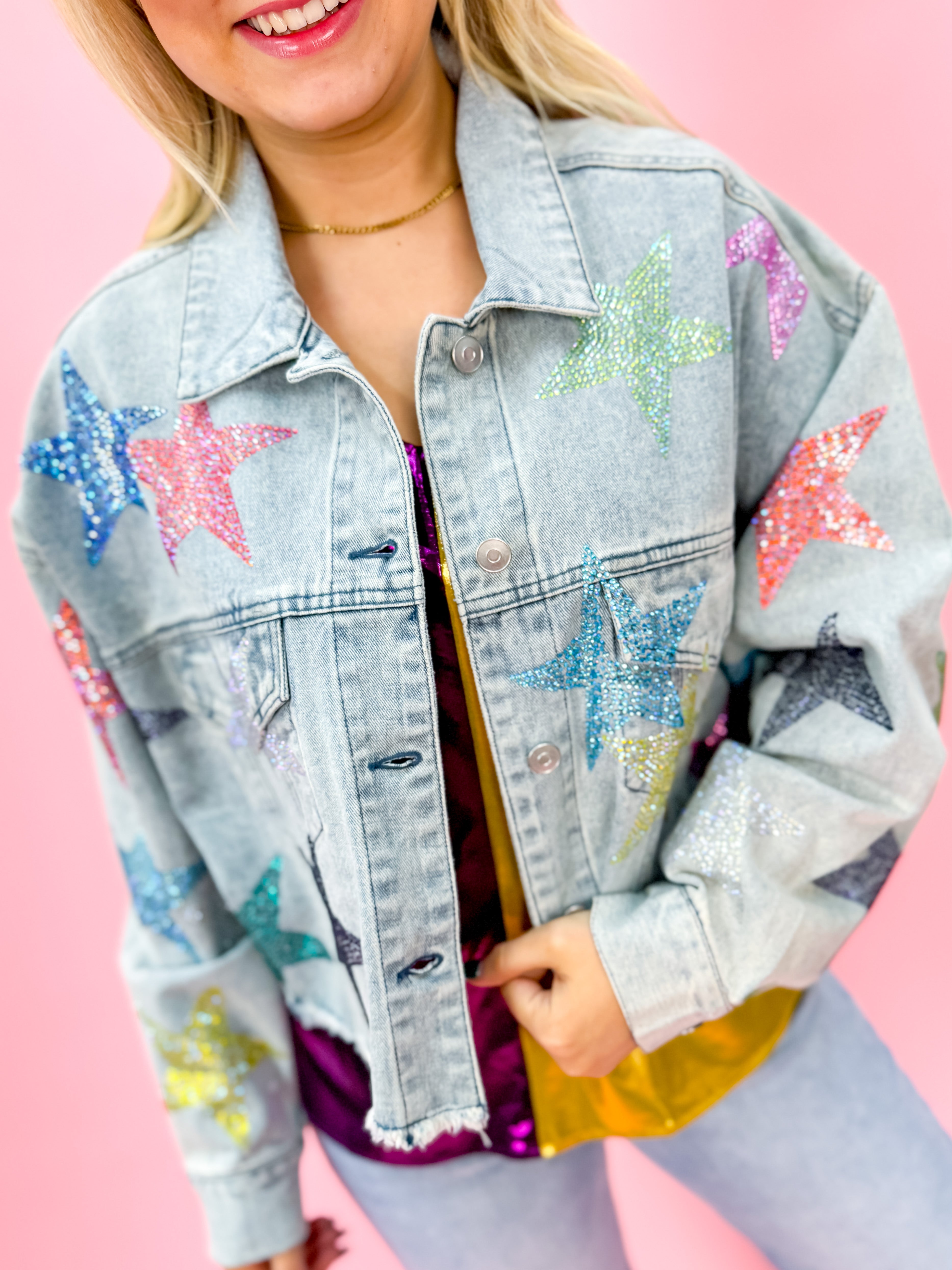 Introducing our Rhinestone Star Boxy Denim Jacket - a dazzling addition to your wardrobe. This collared jacket features long sleeves, a button-down closure, and pockets for both style and functionality. The rhinestone star embellishments add a touch of glamour, while the raw hem brings a hint of edge. Crafted from 100% cotton, it ensures comfort and durability. Elevate your fashion game with this standout denim jacket that seamlessly blends trend and individuality. Make a statement in style with the perfect combination of sparkle, comfort, and a touch of raw, edgy charm.