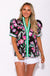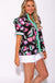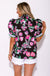 Fresh florals meet bold contrast in this eye-catching split neck top. With a striking black backdrop, the bright pink and green blooms take center stage, while the coordinating striped sleeve band adds a fun twist. It’s the perfect piece to dress up your denim or add flair to your favorite work pants.