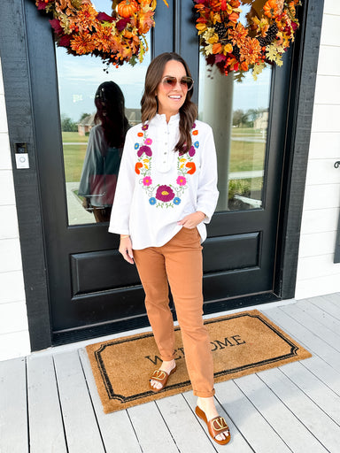 View full detailsIntroducing the JUANA Floral Top in White, a timeless piece that seamlessly blends elegance with a touch of whimsy. This half button-down beauty f...