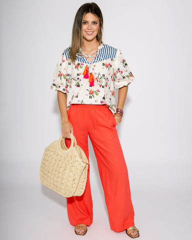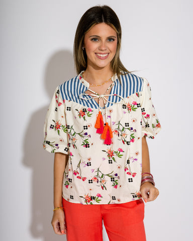 View full detailsThis Floral Ties and Stripes Top features a flattering V-neckline, short bubble sleeves, and a front self tie with contrast tassels. Made with embr...