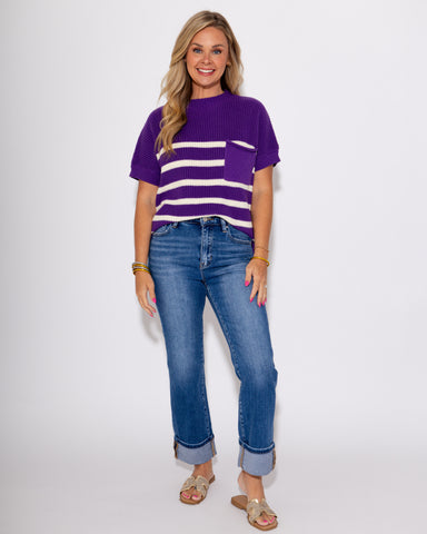 View full detailsUnleash your playfulness with this "Own the Game" slouchy fuzzy knit football sweater in purple. Its oversized fit and ribbed detailing on the neck...