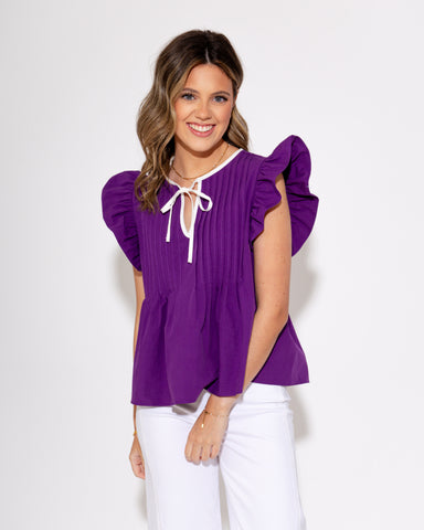 View full detailsIntroducing our Game Day Colors Ruffle Sleeve Contrast Piping Top, the perfect blend of sporty and chic for showing off your team spirit. This styl...