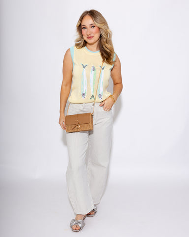 Brighten your wardrobe with this cheerful butter-yellow sleeveless sweater, perfect for warm-weather adventures. Featuring a soft light aqua trim a...