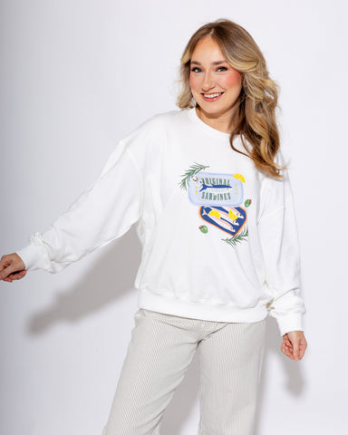 Cozy up in this cream sweatshirt featuring a playful graphic of sardines packed in a tin, artfully adorned with olives and fresh dill. The whimsica...