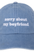 Add a playful twist to your casual look with this washed denim blue ball cap. Featuring bold white stitched lettering that reads “Sorry About My Boyfriend”, this cap blends cheeky attitude with laid-back style. The vintage-inspired washed denim finish gives it that perfectly broken-in, effortlessly cool vibe — ideal for everyday wear or those weekend adventures.