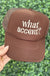 The phrase "What Accent?" on a trucker hat is likely a playful and humorous reference to the idea that the wearer doesn't have a distinctive or noticeable accent. It could be a light-hearted way of suggesting that the person speaks in a neutral or generic manner, making it a fun accessory for someone who may not have a strong regional accent or who enjoys humor related to language and communication. Trucker hats are a popular style of baseball cap known for their mesh panels, typically worn casually and often associated with truck drivers and outdoor activities.