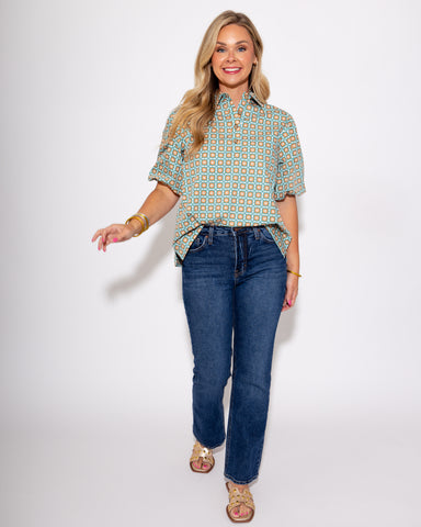 View full detailsMeet your new statement staple. This mustard and cream popover top features a charming mix of abstract squares and triangles in a quilt-inspired pr...