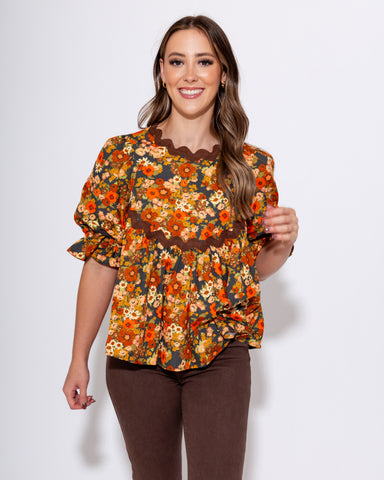 View full detailsCelebrate fall’s rich hues with this charming floral peplum top. Covered in a warm, all-over floral print, it’s accented perfectly by brown ric rac...