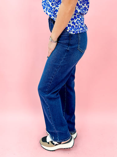 View full detailsHIGH RISE FULL LENGTH CLASSIC STRAIGHT LEG JEANS IN DARK WASH DENIM 11.5" RISE, 29" INSEAM, 7" OPENING 95% COTTON, 4% ELASTERELL-P, 1% SPANDEX