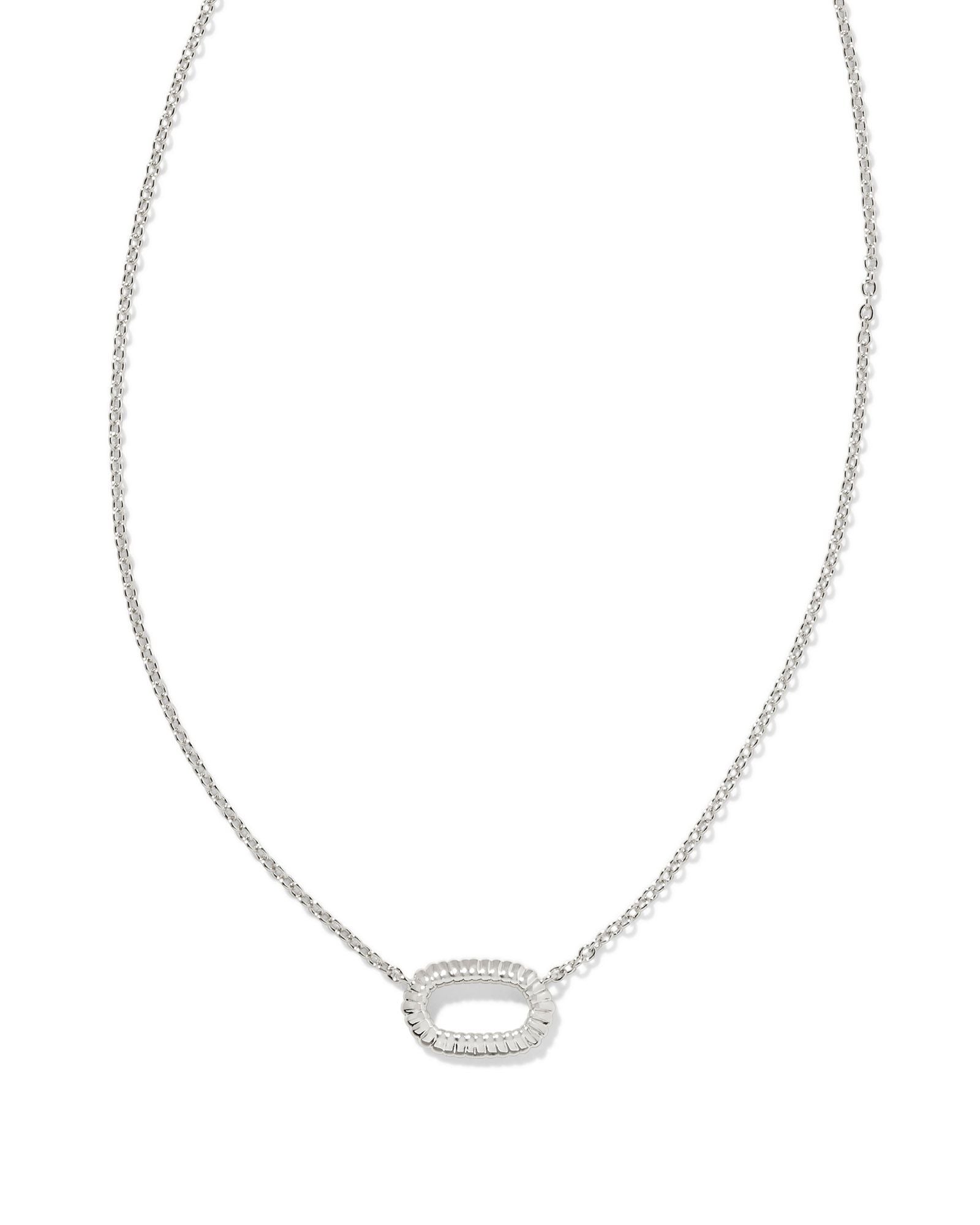 Prep your necklace layers—the Elisa Ridge Open Frame Short Pendant Necklace in Silver is here and ready for the spotlight. Our icon oval shape takes on a textured, open frame, creating a minimal style worth obsessing over.