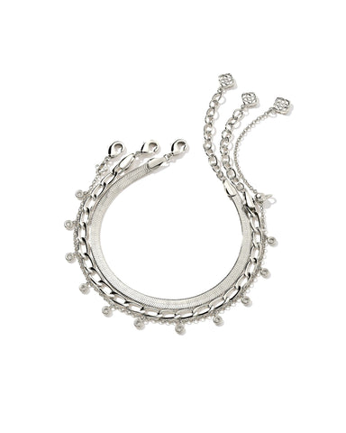View full detailsThe Kassie Set of 3 Chain Bracelet in Silver features three classic chain links. Complete with a herringbone, paperclip, and crystal charm chain, w...