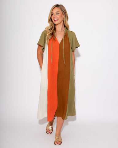 View full detailsThis Color Block Stripes & Tie Midi Dress combines elegant vertical coral, brown, and cream stripes on an olive backdrop for a striking look. F...