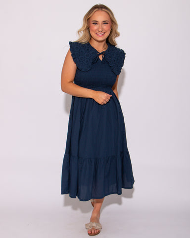 View full detailsElevate your wardrobe with our Navy Lace Embroidered Smocked Midi Dress! This A-Line dress features intricate lace embroidery and a smocked waist f...