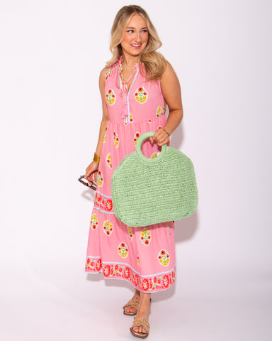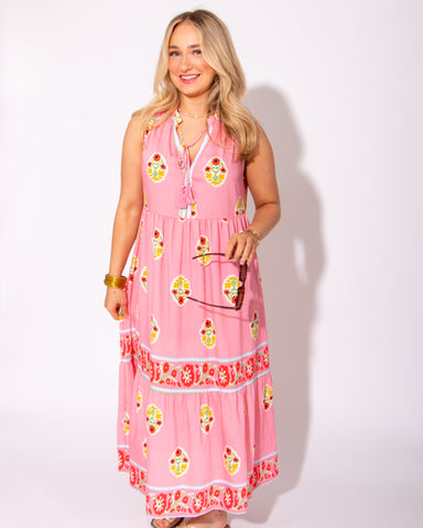 Embrace bohemian beauty in our Floral Print Border Midi Dress! With its vibrant, embroidered flowers and relaxed, tiered silhouette, this sleeveles...