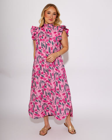 Soft, romantic, and full of charm—this midi dress features a blooming floral print in varying shades of pink. Delicate ruffle flutter sleeves and a...