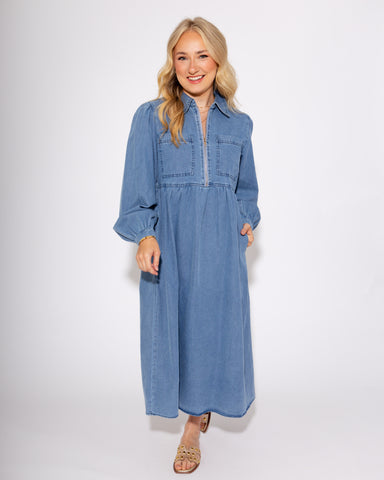 This denim midi dress is a fall essential made for the stylish multitasker—hello teachers, mamas, and on-the-go gals! Featuring a collared neckline...