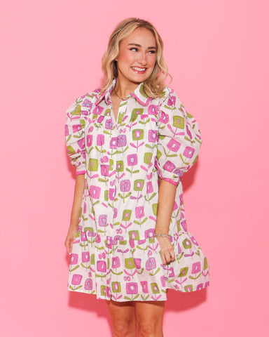 Introducing our Spring Fling Babydoll Dress! This charming dress features a lovely floral print and a ruffle-trimmed high neckline with a notched V...