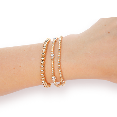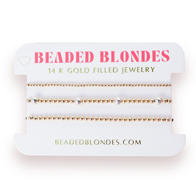View full detailsThe perfect dainty every day stack! Includes: * Olive Mixed Metal Bracelet * 2mm Gold Beaded Bracelet * 3mm Gold Beaded Bracelet 14 K gold filled, ...