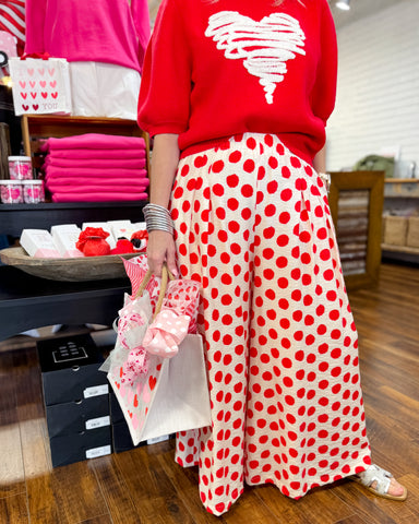 Elevate your style with our Red Polka Dot Pants! Featuring a playful polka dot print, a wide leg cut, and an elastic waistband, these pants offer b...