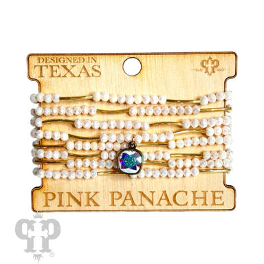 This bracelet set includes 8 strands of crystal and gold tube beads with a 10mm Austrian crystal drop in a setting custom made for us. Stretches fo...