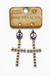 This earring has a gold tone bead cross. They hang from an 8mm iridescent (AB) Austrian crystal in a setting custom made for Pink Panache in the USA. Approximately 2.25 inches in length.