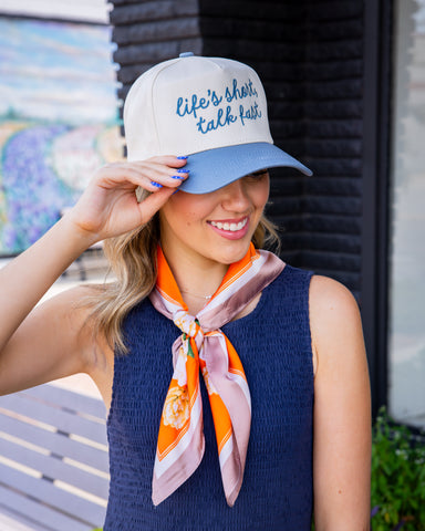 View full detailsMade from durable canvas, this neutral-colored hat features a powder blue bill and matching "Life's Short, Talk Fast" embroidery, blending style wi...