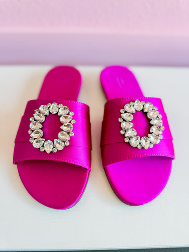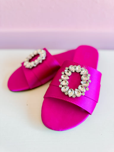 View full detailsThe DIONNE slip-on flat sandals are crafted from glistening satin-effect fabric and feature a striking crystal buckle. Wear yours with denim or dre...