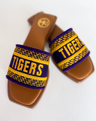 View full detailsShow your team spirit with the Game Day Tiger Sandal in vibrant purple and gold. This essential sandal features a sleek, slip-on design with a sing...