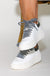 Presenting the SALLY sneaker - an embodiment of style and comfort. These sneakers feature a tall rubber platform, padded insole, vibrant-hued panels, and a color-block heel counter. Constructed from smooth, high-quality faux leather, the chic white body is accentuated by a contrasting nude minimalistic heel tab and a chunky rubber sole. The brand icon adds a cool touch to the shoes. Pair these sneakers with a slim-fitting suit for a sophisticated look.