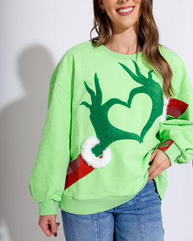 Bring holiday mischief and cheer to your wardrobe with the Green Grinch Heart Hands Sweatshirt by Queen of Sparkles. Featuring the iconic Grinch ha...
