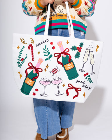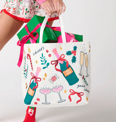 View full detailsPop, fizz, and carry on with the Bubbles Gifting Tote! Bursting with holiday cheer, this festive white tote is adorned with playful champagne bottl...