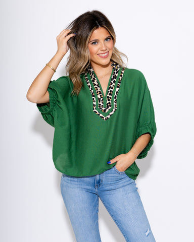 Introducing The Roar Line Top in Fern, a versatile and fashionable dolman top that will elevate your wardrobe. This solid top features a leopard pr...