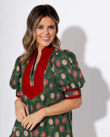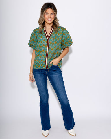 View full detailsElevate your everyday style with this dark mint puff sleeve top, featuring a subtle monochrome floral print. The split neckline and center front ar...