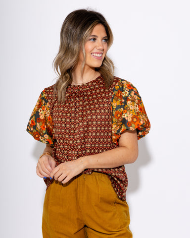 View full detailsElevate your wardrobe with the Shoulder Pop Multi-Print Top in Plum. This stylish short puff sleeve top features a round split neckline and a charm...