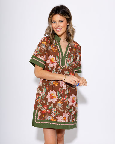 View full detailsVintage charm meets everyday ease in this floral print mini dress, designed with a rich brown backdrop and soft pops of pink, green, and sun-washed...