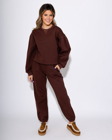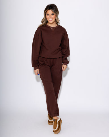 View full detailsComfy meets polished in this rich chocolate brown fleece set, designed for elevated everyday lounging. The crewneck sweatshirt features pleated sho...