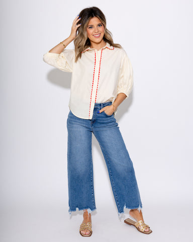 View full detailsIntroducing the Wavy Trim Delight Button Up Top in Cream! This fashion-forward blouse features intricate wavy trim detailing and chic puff sleeves....