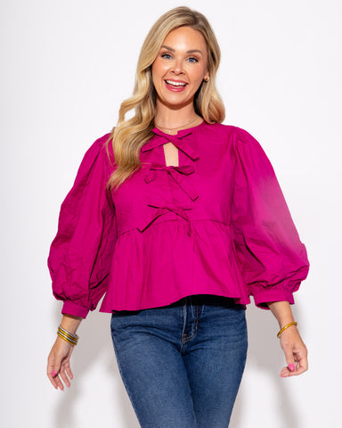 View full detailsIntroducing the Peplum Poise Bow Top, the missing piece to your wardrobe! With its elegant peplum design and playful bow tie, this top adds a touch...