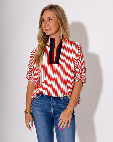 View full detailsElevate your everyday style with our Striped Split High Neck Dolman Top! This lightweight, woven top features a unique split neck design with an ac...