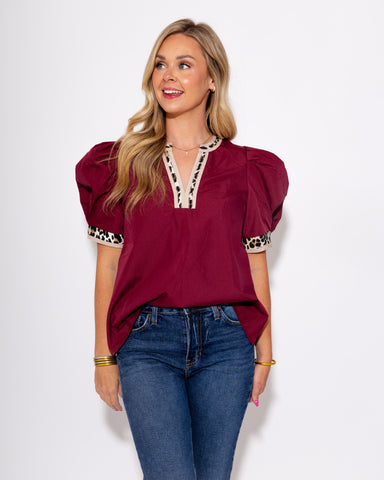 View full detailsElevate your style with our Barely Wild Top in Wine. This pullover top features voluminous pleated short sleeves and a distinctive V-neck band that...