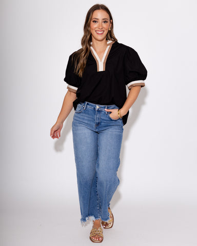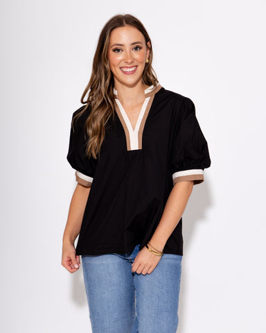 View full detailsClassic with a modern twist, this rich black top features a split collar neckline and short sleeves with banded scrunch detailing for a hint of pla...
