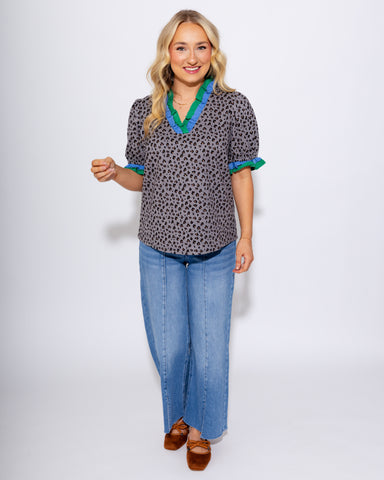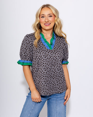View full detailsElevate your style with the Double Contrast Ruffle Detailed Animal Printed Top. Featuring a subtle grey background with eye-catching blue and green...