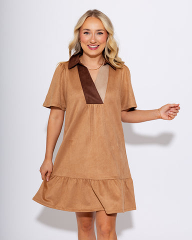 View full detailsBring texture and warmth to your fall wardrobe with the Ruffled Suede Mini Dress. Crafted in rich camel and brown suede with tan accents along the ...