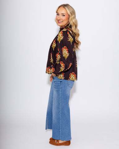 View full detailsBring effortless charm to your wardrobe with the Petal Pop Long Sleeve Top. Set against a sleek black background, the green and pink floral print a...